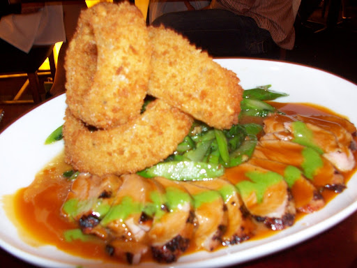 Entree I: Asian Barbeque Pork – slices of grilled tenderloin with chinese broccoli and giant panko crusted onion rings ($26)
