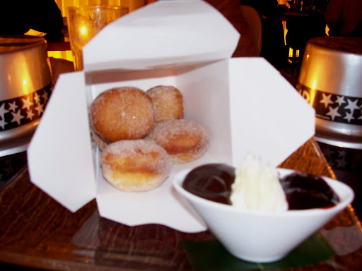 My favorite dessert at Buddakan is the Banana Tower. Sadly, the Astronomer is not a fan of bananas so we compromised and ordered the Dip Sum Doughnuts and they were fabulous. The doughnuts were warm out of the deep fryer and evenly coated with sugar and a little spice, but mostly sugar. All of the sauces were great, but my favorite was the cream cheese with bits of crystallized ginger. Yum!