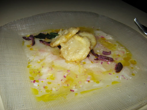 Appetizer I: Fire and Ice Ceviche – fluke with preserved lemon, sage, hot garlic oil and crispy lemon rings ($12)
