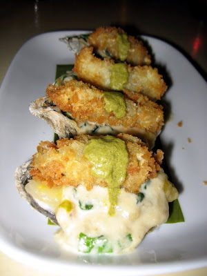 Entree II: Oyster Rodriguez – crispy fried over fufu (mashed sweet plantains with bacon) sauteed spinach with horseradish and huacatay sauce ($14)