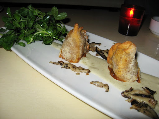 Appetizer II: Braised Oxtail Empanada – Panca Chile empanada dough, Cabrales fondue, truffled pea greens, and roasted Shitake mushrooms ($13)