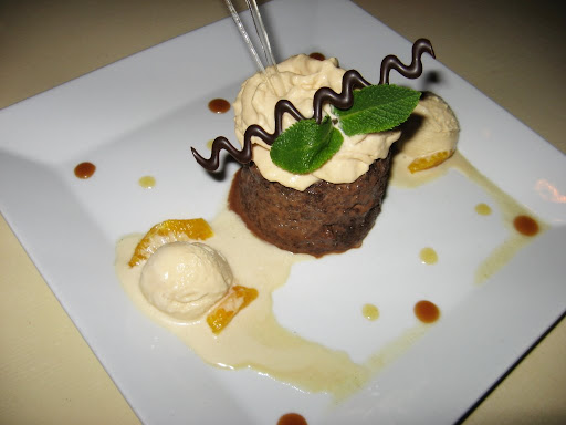 Dessert I: Chocolate Tres Leches – served with caramel expuma, vanilla poached oranges, and a salted caramel ice cream ($9)