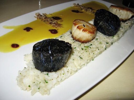 Entree I: Domino Scallops – Seared diver scallops with squid ink, lemongrass rice, toasted coconut ($28)