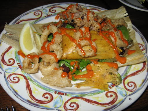 Appetizer: Tamal Cubano – traditional Cuban fresh sweet corn tamal filled with shrimp, crab and ground conch. Topped with crisp calamari, avocado and chipotle vinaigrette ($13)