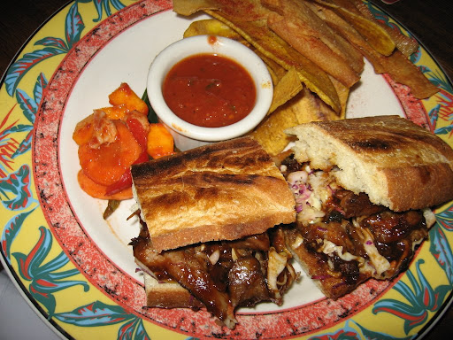 The Astronomer and I shared the Guava BBQ Rib Sandwich and the 10 Cane Tuna. The sandwich tasted like a southern pulled pork sandwich gone tropical, which the Astronomer and I really liked. The BBQ sauce was sticky and sweet, but debatably guava. The slaw was lost in the abundant sauce and the bread was substantial enough to hold in the ample fixings. Some non-descript chips were served on the side, which I left up to the Astronomer.