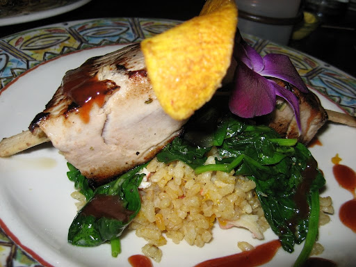 Entree II: 10 Cane Tuna – sugar cane skewered tuna marinated with guava, soy sauce and 10 cane rum. Pan seared and served on coconut-calabaza rice tossed with king crab leg ($26)
