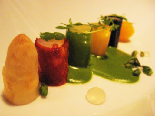 I was informed by one of our waiters that the liquid filled sphere was created through a dual refrigeration and freezing process. The celery and horseradish juice is initially frozen in a spherical mold. After the sphere freezes, it is dipped in multiple layers of cocoa butter. The outer layers of cocoa butter adhere to the frozen juice ball and solidify. The sphere is then placed in a refrigerator. As the temperature drops, the internal juice melts and the cocoa butter remains intact.