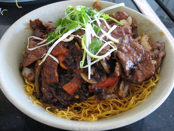 Mi Bo Satay Kho – Thin egg noodles topped with beef, tomatoes and onions in a Satay sauce ($5.50)