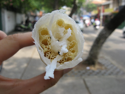I bought this little ice cream cone impulsively on a super-hot day in District 4 on Ton That Thuyet Street. It tasted sweet, funny and not much else. Although I like having funny friends, I cannot appreciate funny ice cream in the same way. For really super fantastic ice cream, visit Cong Truong for their kem trai dua.