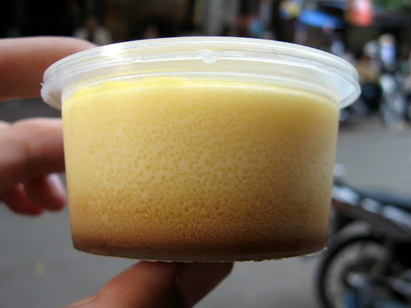 In Saigon, banh kem flan are sold in sweet shops that usually also dish up che. The flan are made in small plastic containers and refrigerated until served. Once an order is placed, the flan are inverted onto a plate and topped with crushed ice or small ice cubes. A plate of two banh kem flan goes for 4,000 VND. Once, I ate a banh kem flan that was topped with a shot of espresso in addition to ice. It was too bitter for me, but I can definitely see the appeal for a coffee lover. Banh kem flan can also be purchased from road side vendors and consumed at home. Inverting is completely optional.