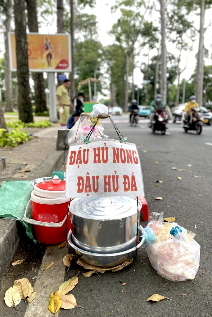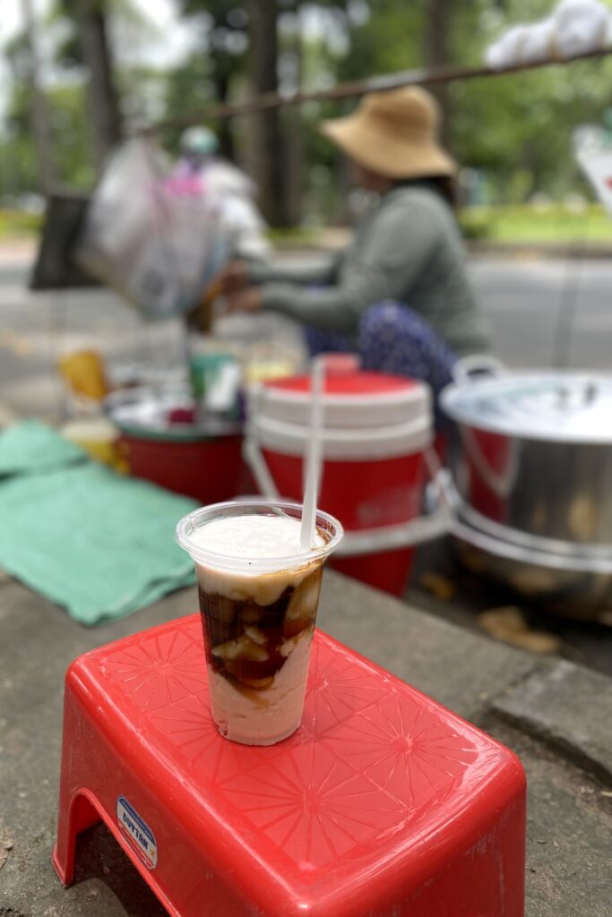 Everyone in our family loves ginger tofu, so we were on the lookout for it in the afternoons when the vendors usually offer the dessert. We encountered some on our first afternoon in Saigon and savored it on a teeny red plastic stool while watching traffic whiz by.